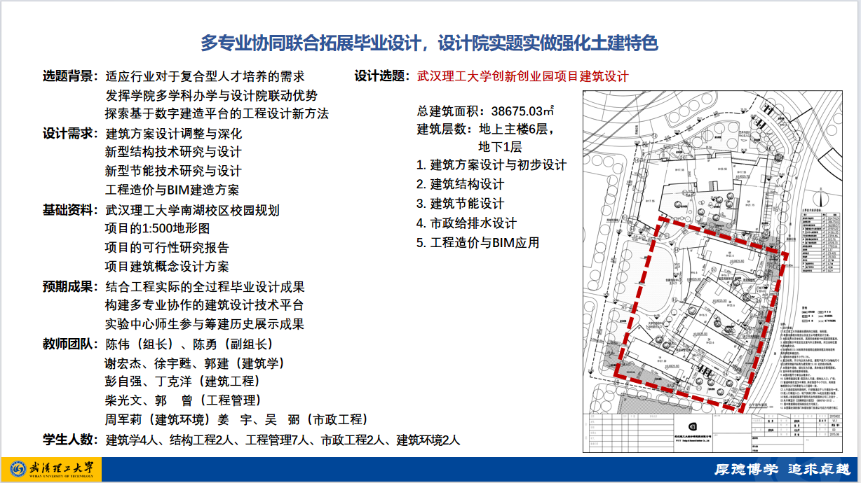 陈伟副院长介绍了本届联合毕业设计的基本情况。明确了本次毕业设计以“武汉理工大学创新创业园项目建筑设计”为核心选题,紧扣行业复合型人才培养需求,依托博彩网址导航 多学科办学与设计院联动优势,探索数字建造平台下的工程设计新方法。项目依托南湖校区1:500地形图、可行性研究报告等真实基础资料,要求学生在教师团队指导下完成从方案调整到技术深化的全过程设计,真正实现“做中学、学中做”。